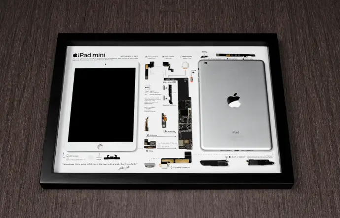 The iPad Mini (1st generation) features in palm-size hand(8.3" widescreen), with a powerful A15 Bionic chip & a 12MP wide camera. It was first announced on October 23, 2012, and was released on November 2, 2012. It is a magic iPad where big ideas come to life, a device unlike any other! The "Grid iPad Mini (1st generation)" frame is meticulously designed to be beautiful, showing inside of this magic!
